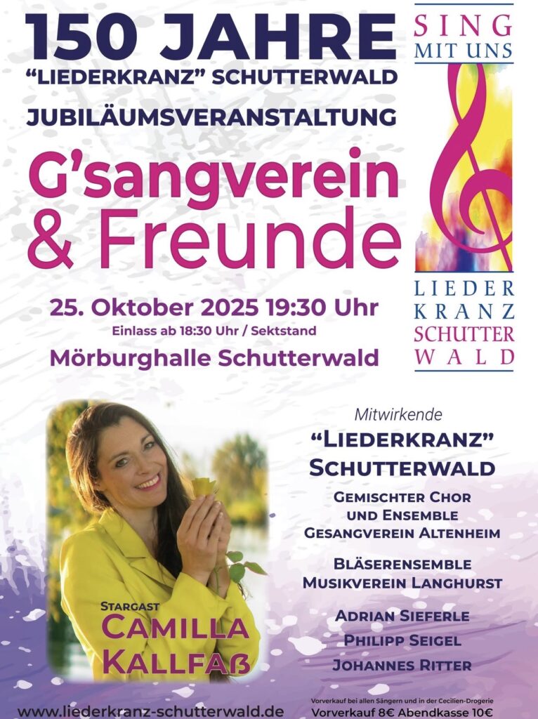 Samstag 25. Oktober19:30Jubiläumsveranstaltung 150 Jahre Liederkranz Schutterwald (G’sangverein & Freunde)Mörburghalle