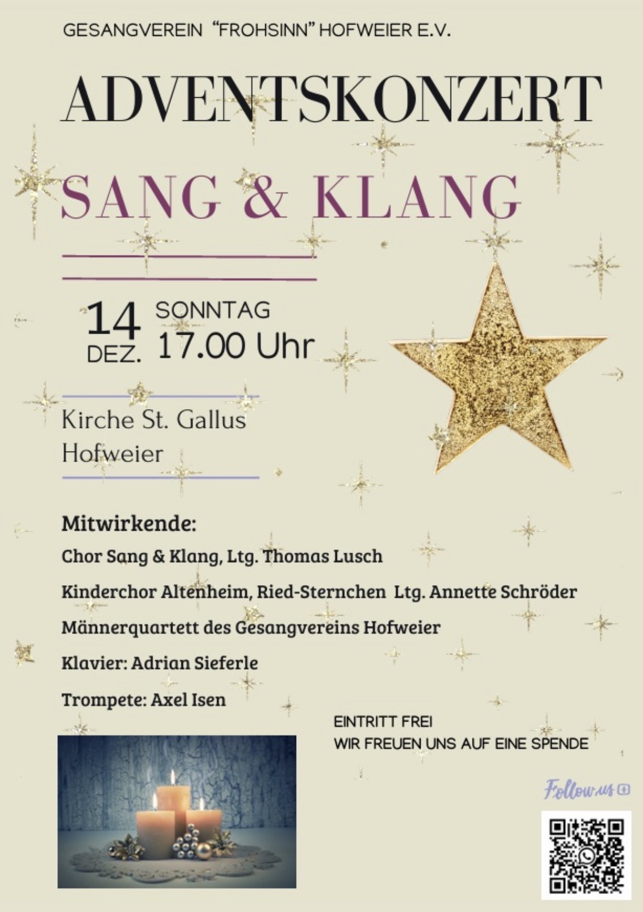 Sonntag 14. Dezember17:00Adventskonzert Gesangverein Sang und Klang Hofweier